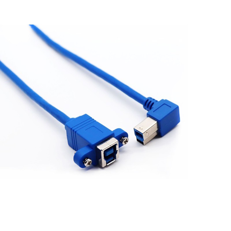 Starte makes 90 Degree Angled USB 3.0 Type B Male to Female Cable with Panel Mount Screw Holes. Also named Screw Lock Panel Mount 90 degree USB3.0 Type B Male to Female Cable. This 90 degree USB 3.0 back panel mount B male To female B type extension cable features a 90 degree USB3.0 Type B male connector on a side, which is suitable for tight and space constrained applications.A bulkhead USB3.0 Type B female connector with screw holes on another side, which is suitable for secure installation.